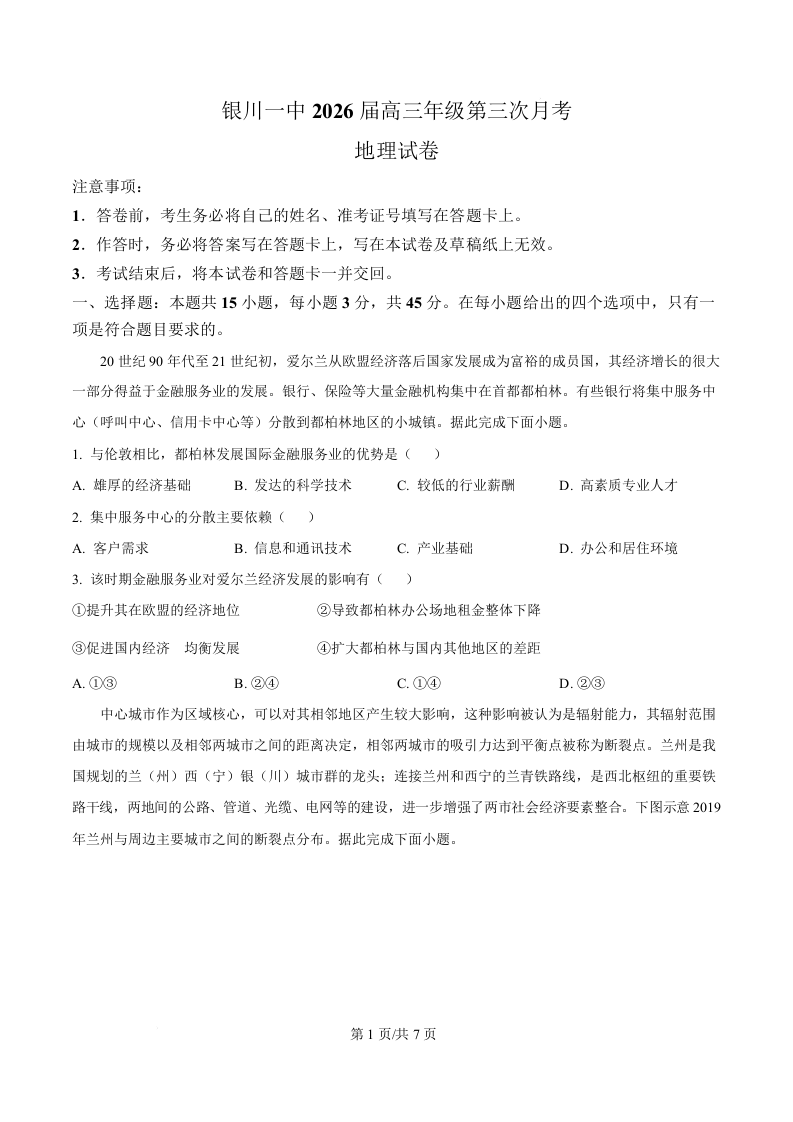 宁夏银川市一中2026届高三上学期第三次月考 地理.docx