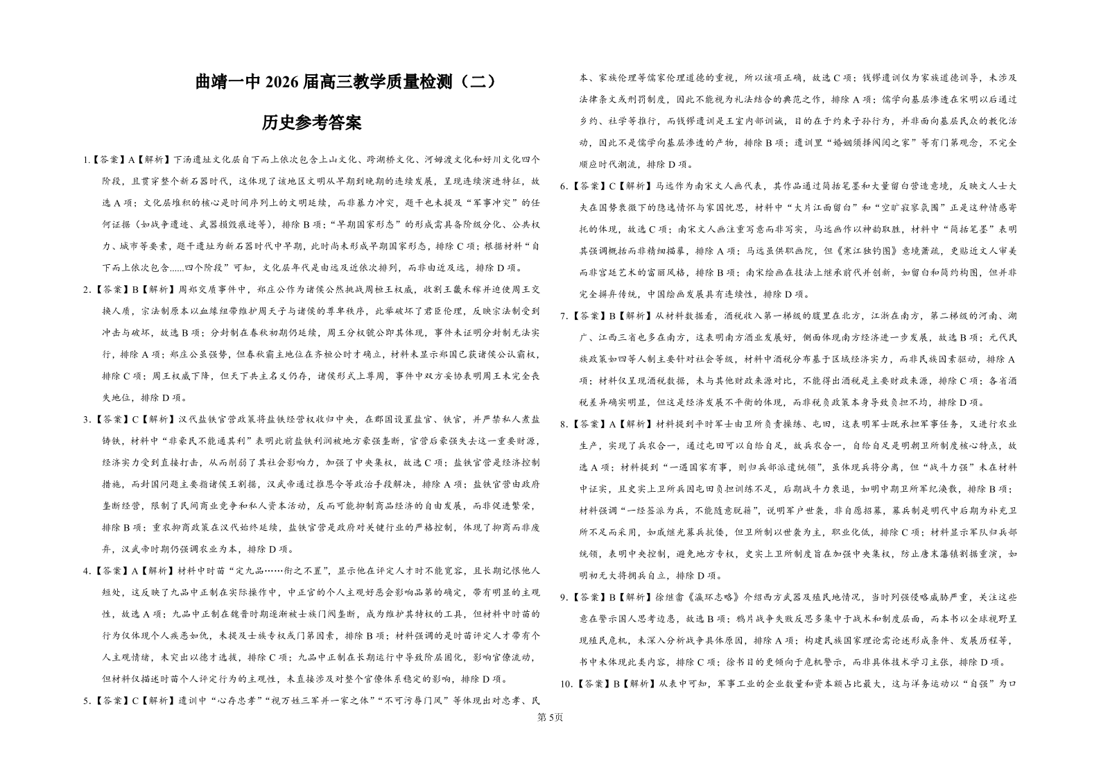 曲靖一中2026届高三年级上学期第三次阶段性测试 历史答案.pdf