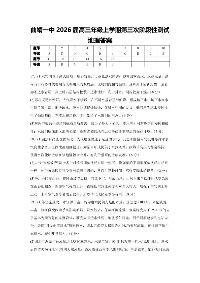 曲靖一中2026届高三年级上学期第三次阶段性测试 地理答案.pdf