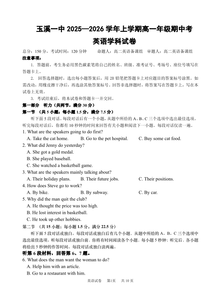 云南省玉溪第一中学2025-2026学年高一上学期期中考试 英语.pdf