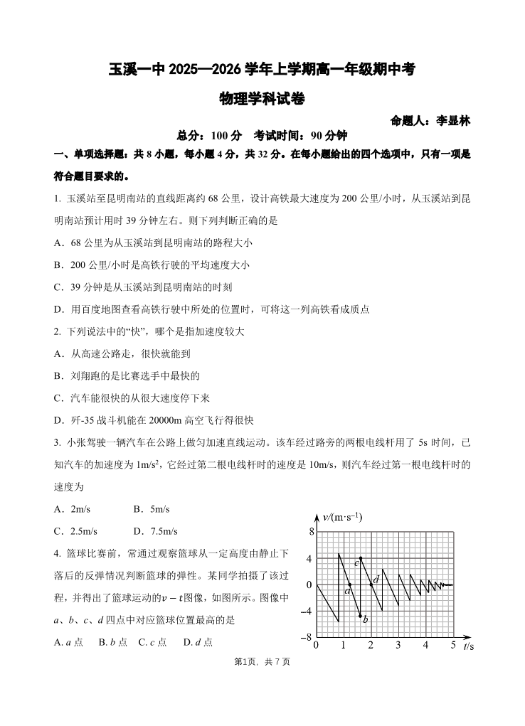 云南省玉溪第一中学2025-2026学年高一上学期期中考试 物理.pdf