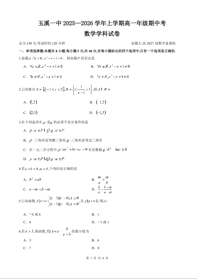 云南省玉溪第一中学2025-2026学年高一上学期期中考试 数学.docx