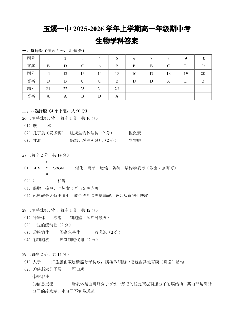 云南省玉溪第一中学2025-2026学年高一上学期期中考试 生物答案.pdf