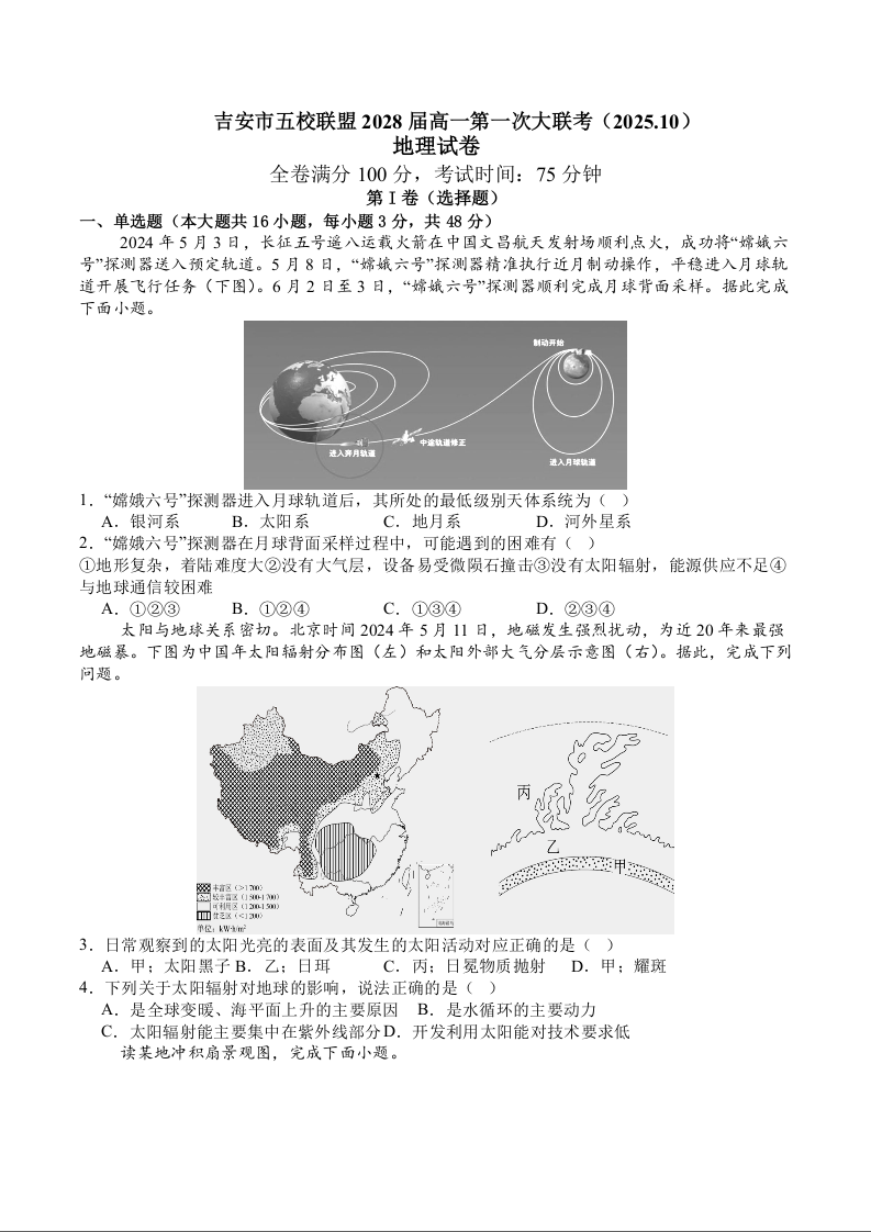 江西省吉安市五校联盟2025-2026学年高一上学期第一次大联考 地理试题(含答案).docx