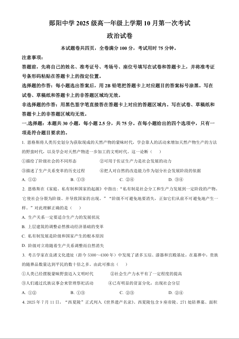 湖北省十堰市郧阳中学2025-2026学年高一上学期期中考试 政治.docx