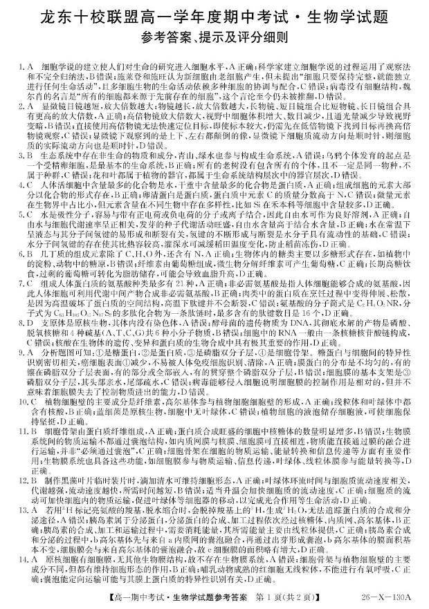 黑龙江省龙东十校联盟2025-2026学年高一上学期期中考试 生物答案.pdf