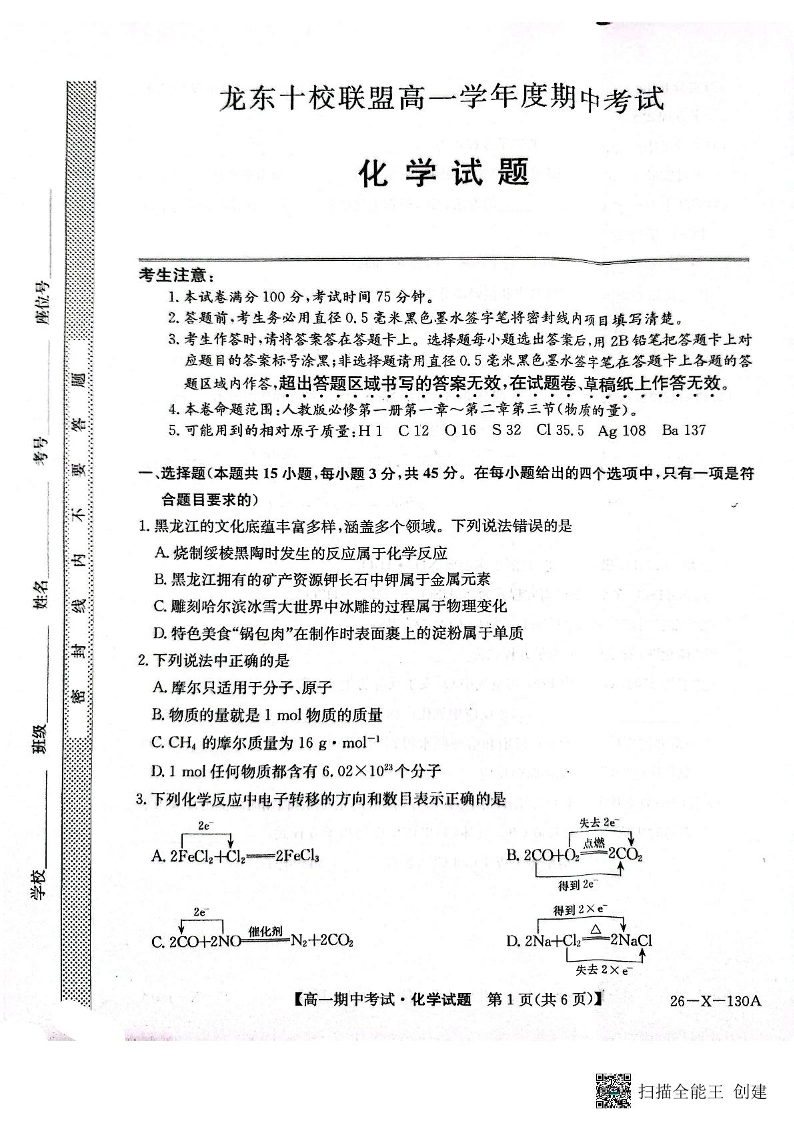 黑龙江省龙东十校联盟2025-2026学年高一上学期期中考试 化学.pdf
