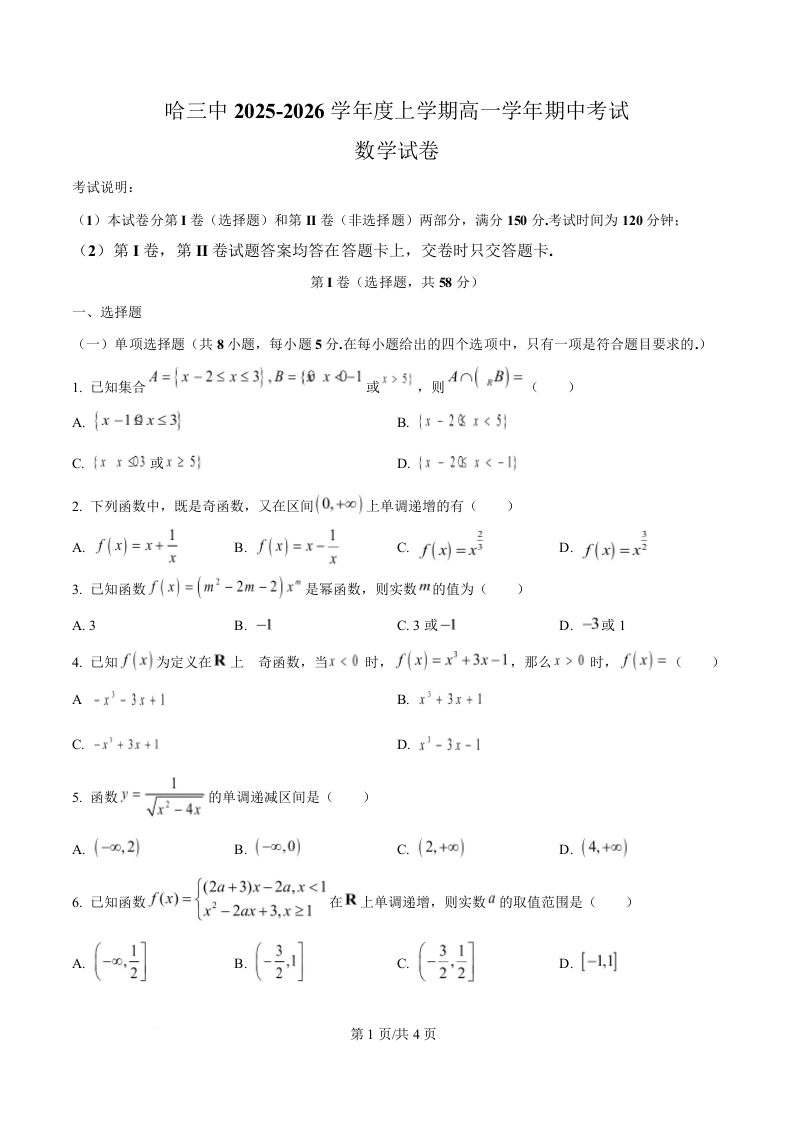 黑龙江省哈尔滨市第三中学校2025-2026学年高一上学期期中考试 数学.docx