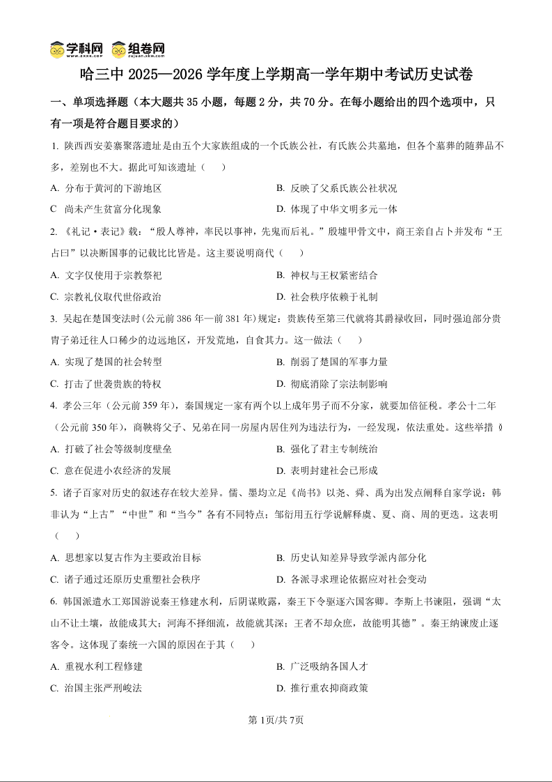 黑龙江省哈尔滨市第三中学校2025-2026学年高一上学期期中考试 历史.docx