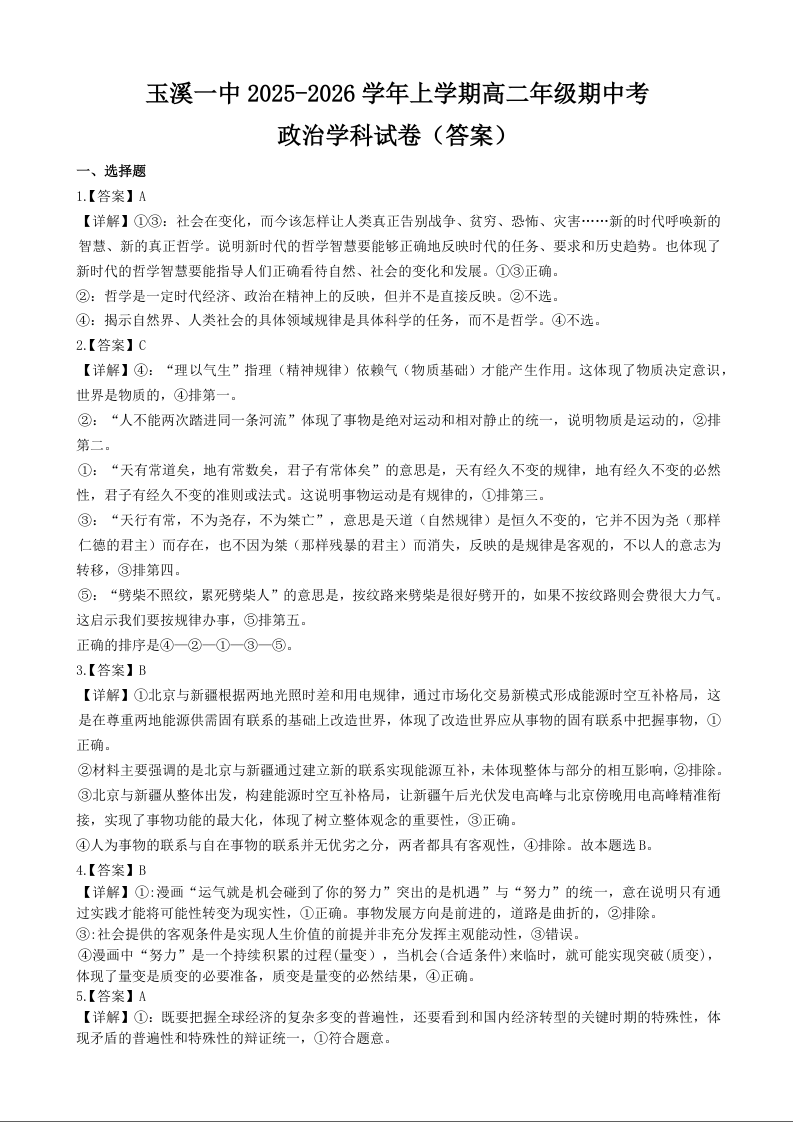 云南省玉溪第一中学2025-2026学年高二上学期期中考试 政治答案.docx