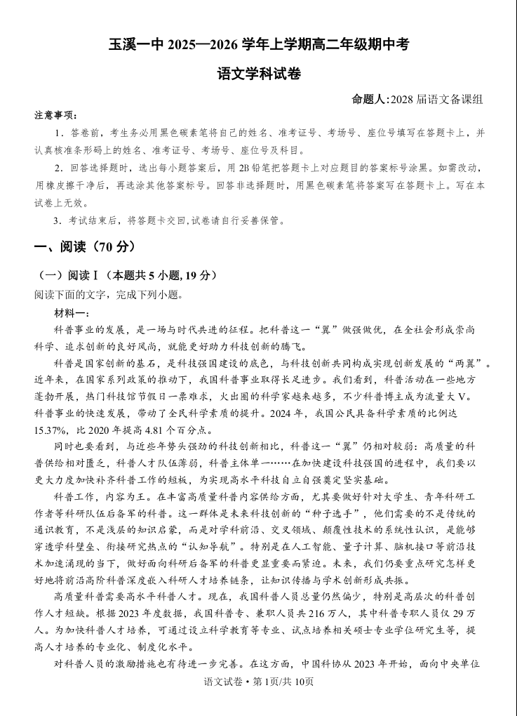 云南省玉溪第一中学2025-2026学年高二上学期期中考试 语文.docx