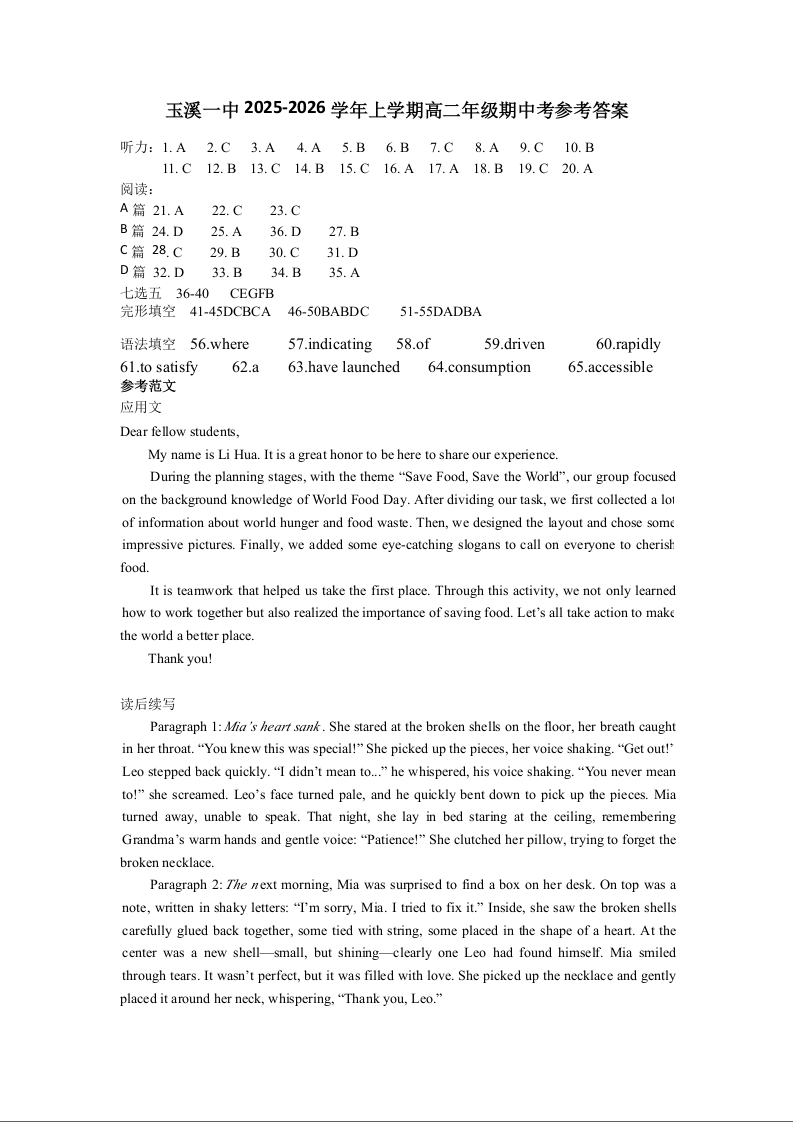 云南省玉溪第一中学2025-2026学年高二上学期期中考试 英语答案.docx