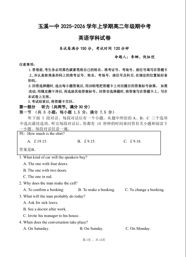 云南省玉溪第一中学2025-2026学年高二上学期期中考试 英语.docx