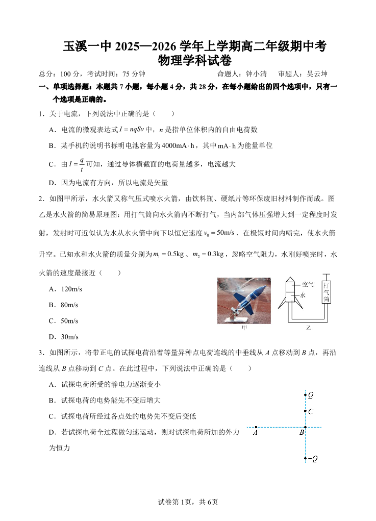 云南省玉溪第一中学2025-2026学年高二上学期期中考试 物理试题(含答案).pdf