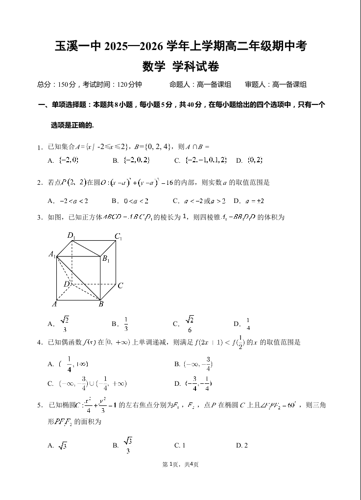 云南省玉溪第一中学2025-2026学年高二上学期期中考试 数学.docx