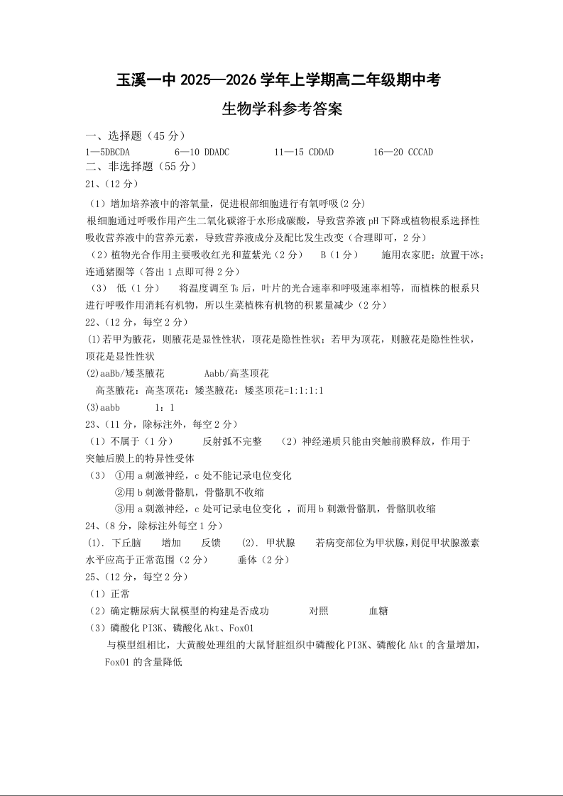 云南省玉溪第一中学2025-2026学年高二上学期期中考试 生物答案.docx