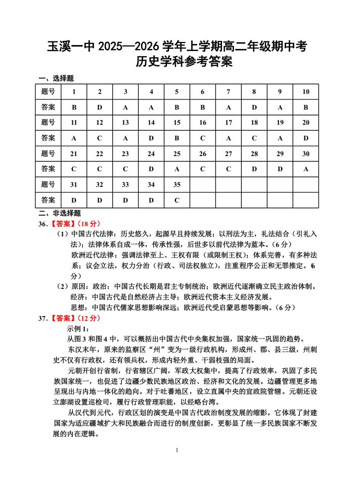 云南省玉溪第一中学2025-2026学年高二上学期期中考试 历史答案.docx
