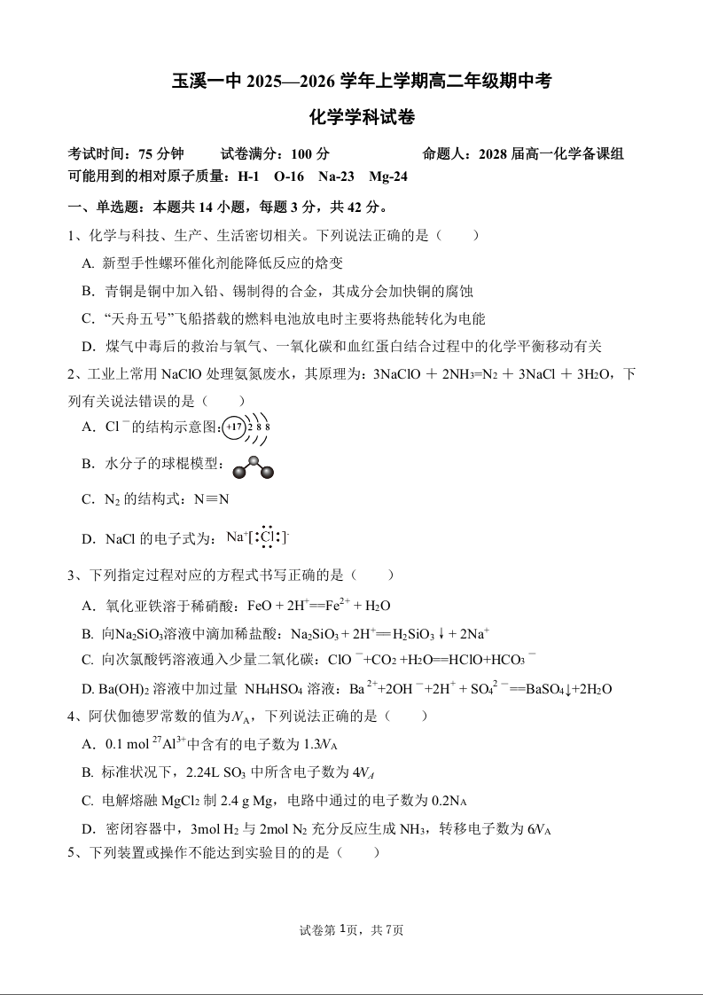 云南省玉溪第一中学2025-2026学年高二上学期期中考试 化学.docx