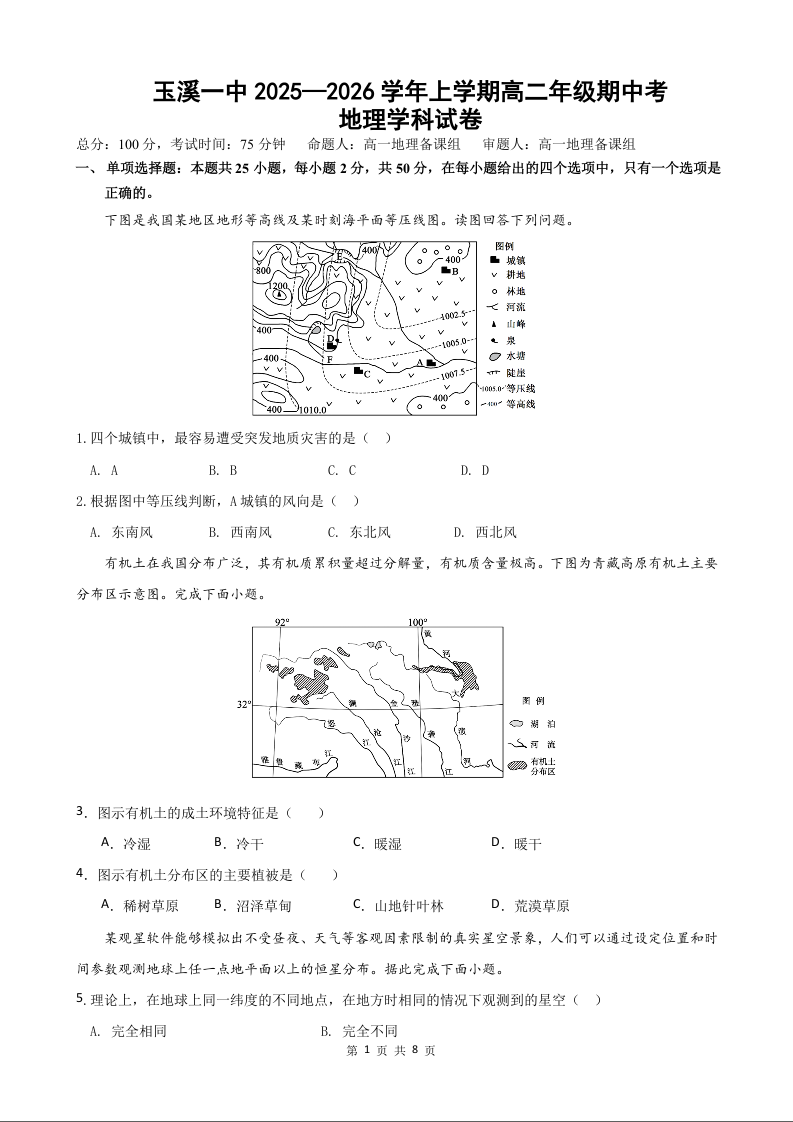 云南省玉溪第一中学2025-2026学年高二上学期期中考试 地理.docx