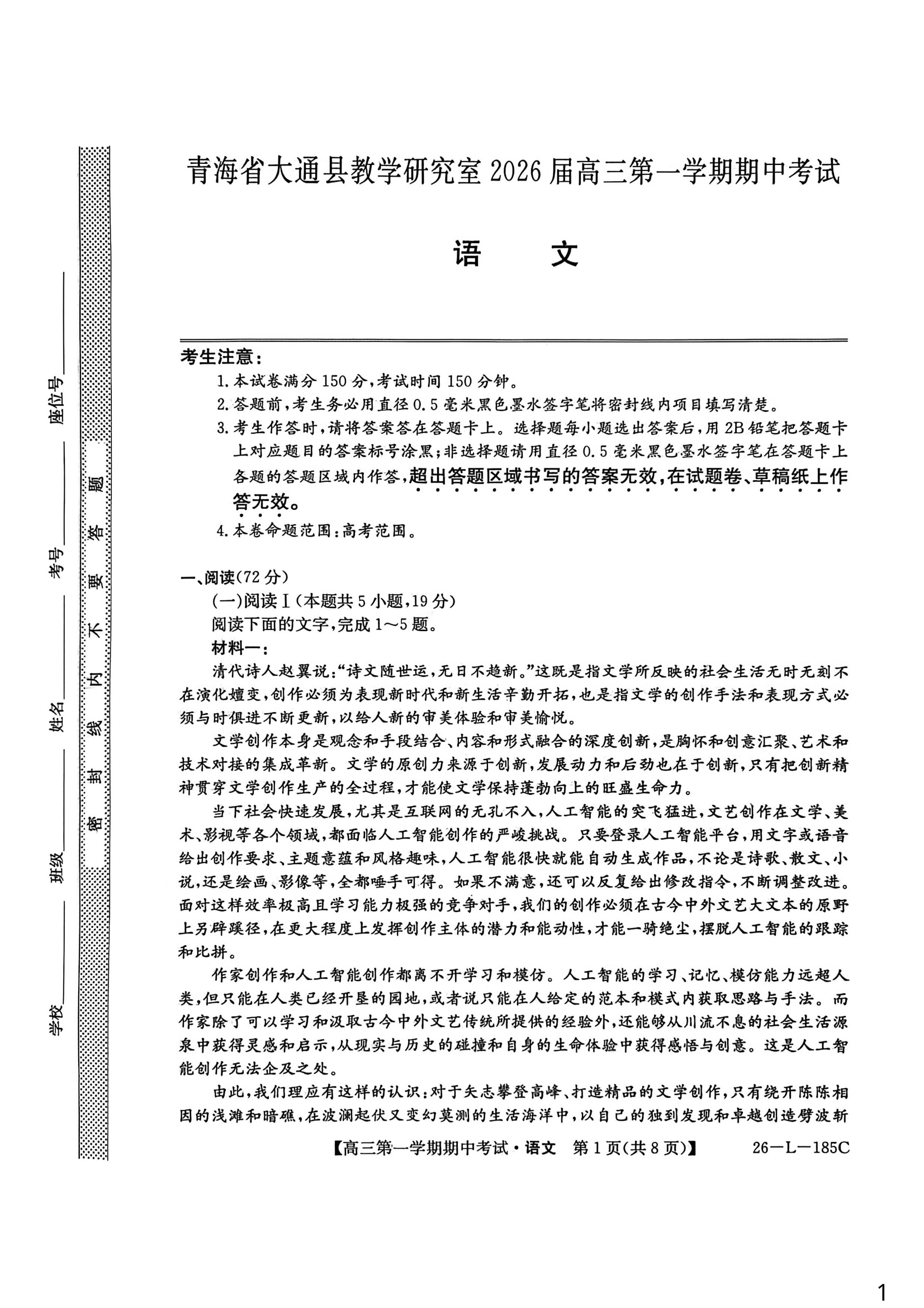 青海省西宁市大通县2025-2026学年高三上学期期中考试 语文试卷(含答案).pdf