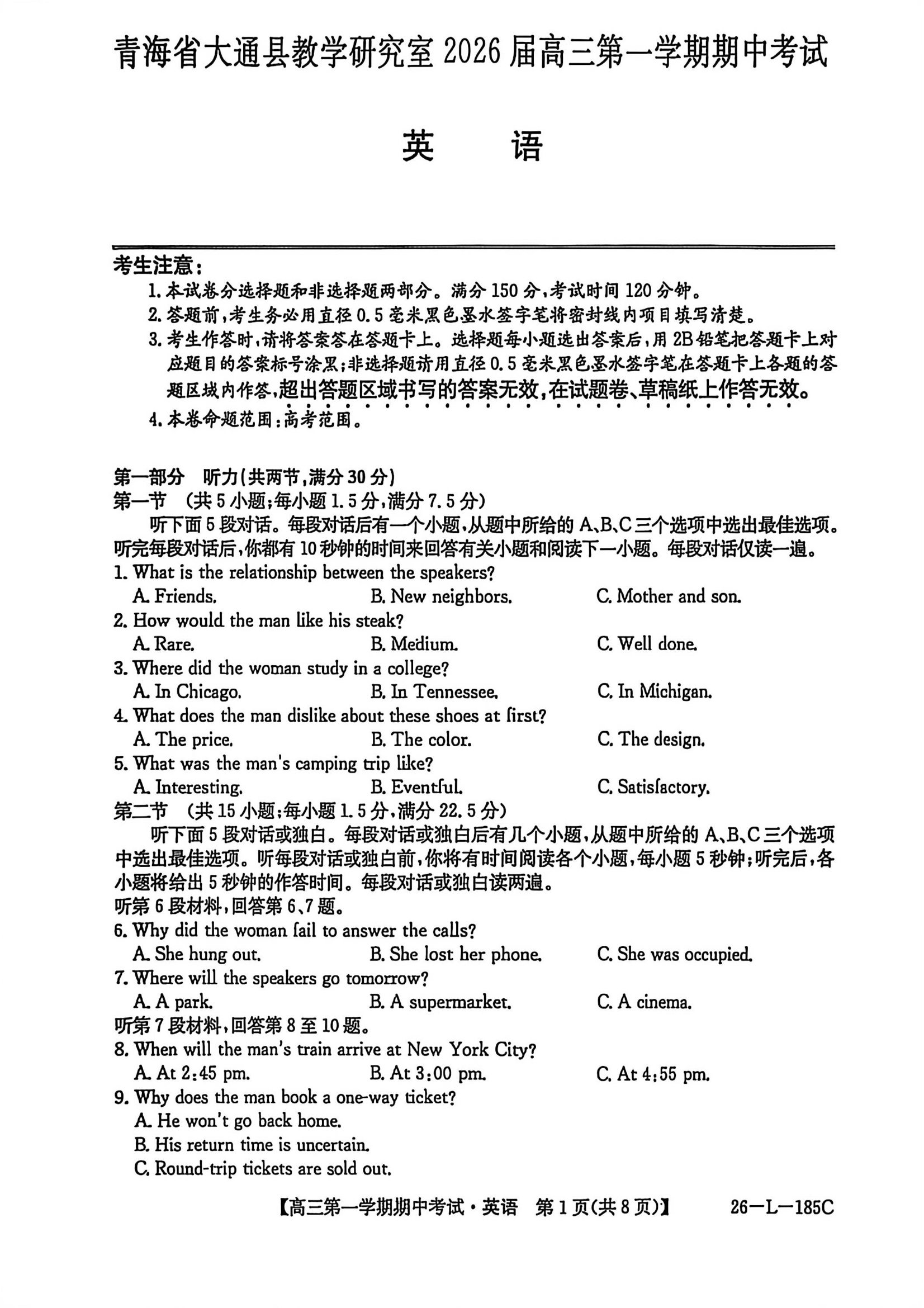 青海省西宁市大通县2025-2026学年高三上学期期中考试 英语试卷(含答案).pdf