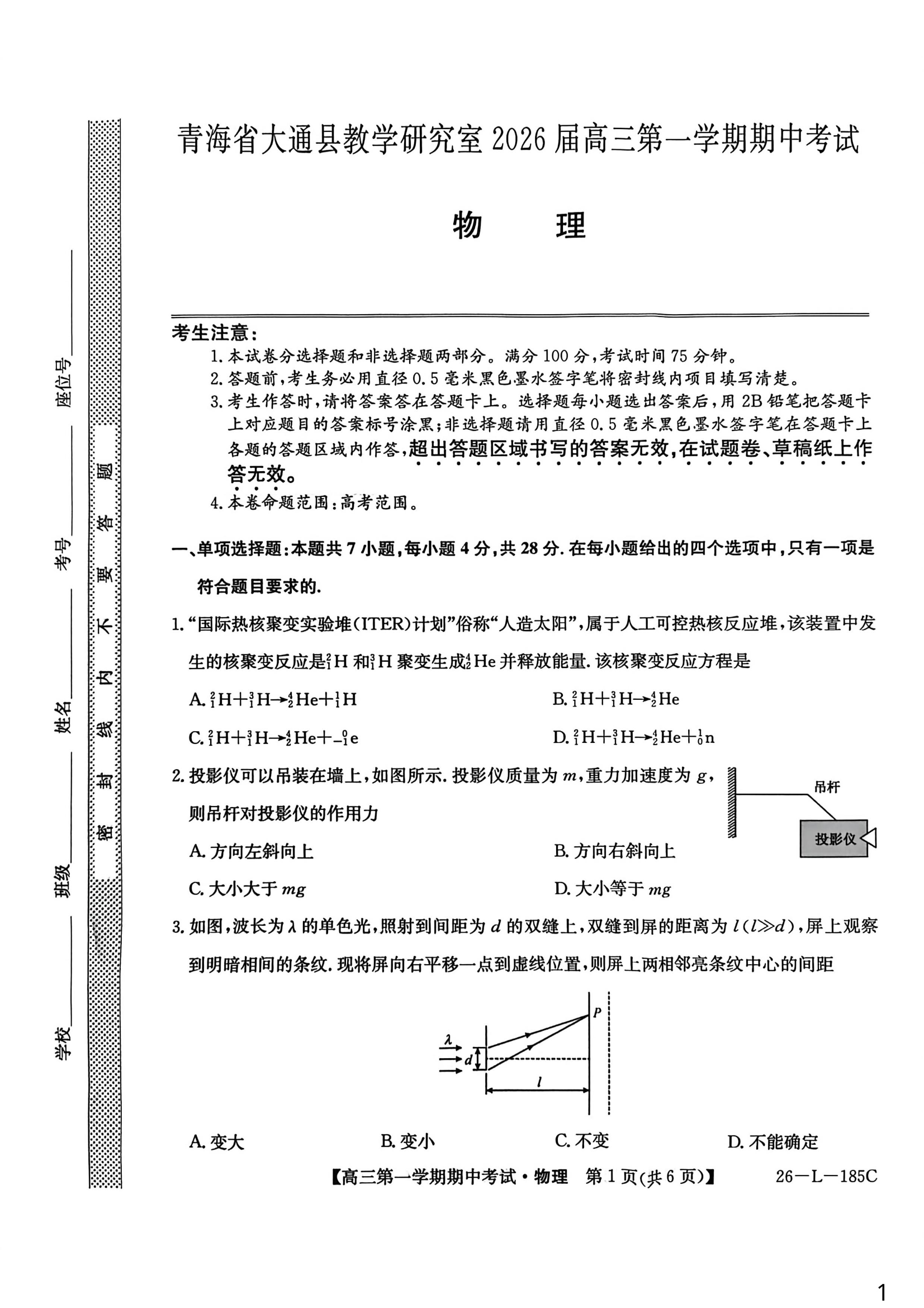 青海省西宁市大通县2025-2026学年高三上学期期中考试 物理试卷(含答案).pdf