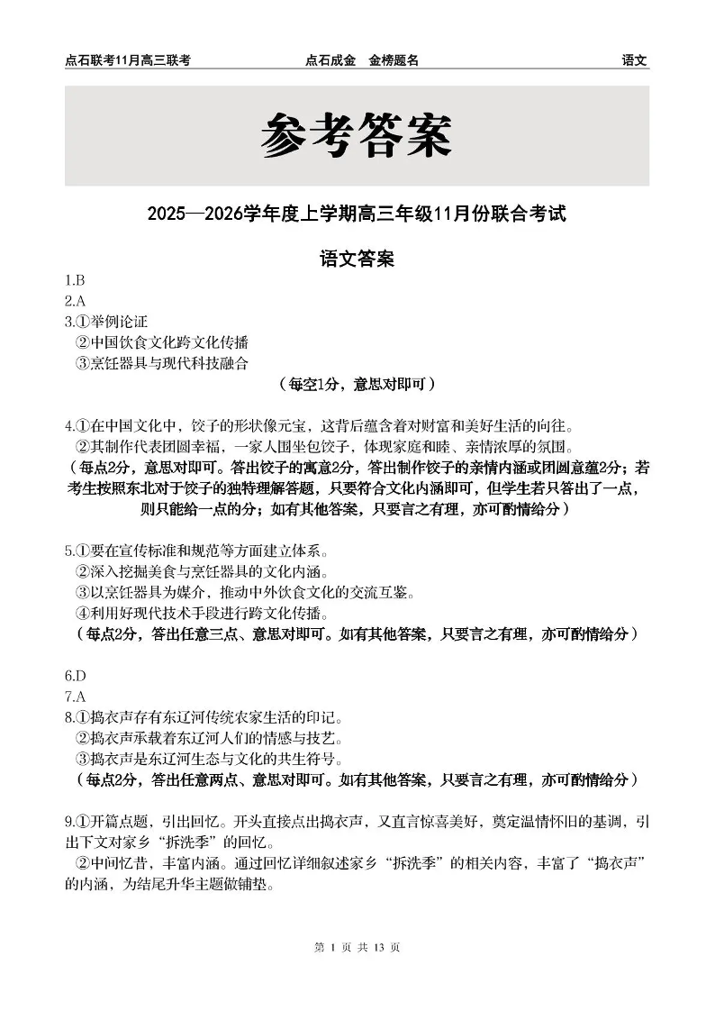 点石联考2025—2026学年度上学期高三年级11月份联合考试 语文答案.pdf