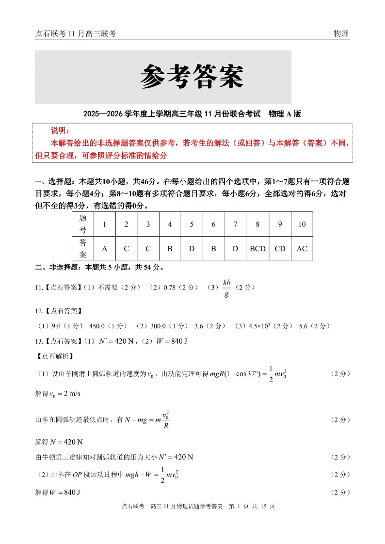 点石联考2025—2026学年度上学期高三年级11月份联合考试 物理答案.pdf