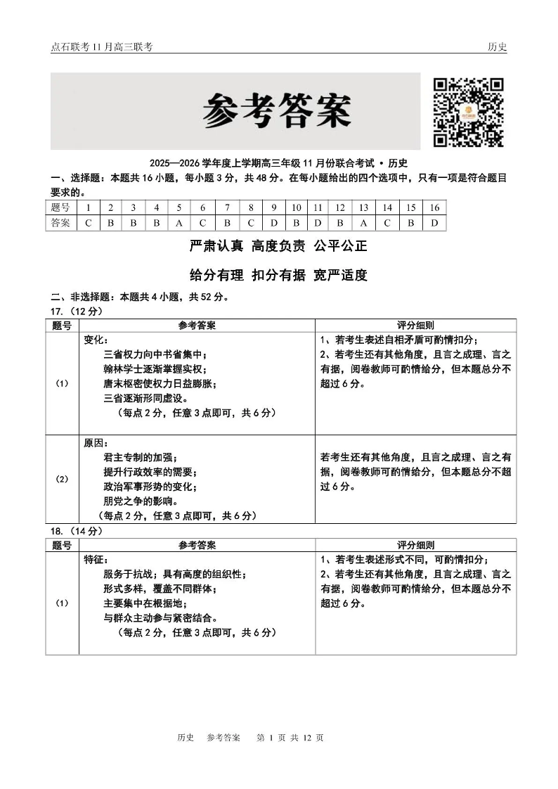 点石联考2025—2026学年度上学期高三年级11月份联合考试 历史答案.pdf