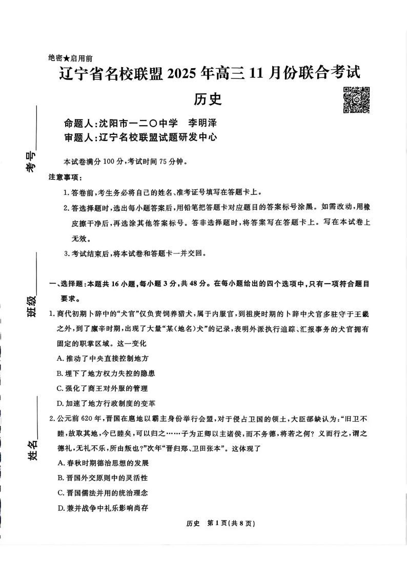 辽宁省名校联盟2025年高三11月份联合考试 历史.pdf