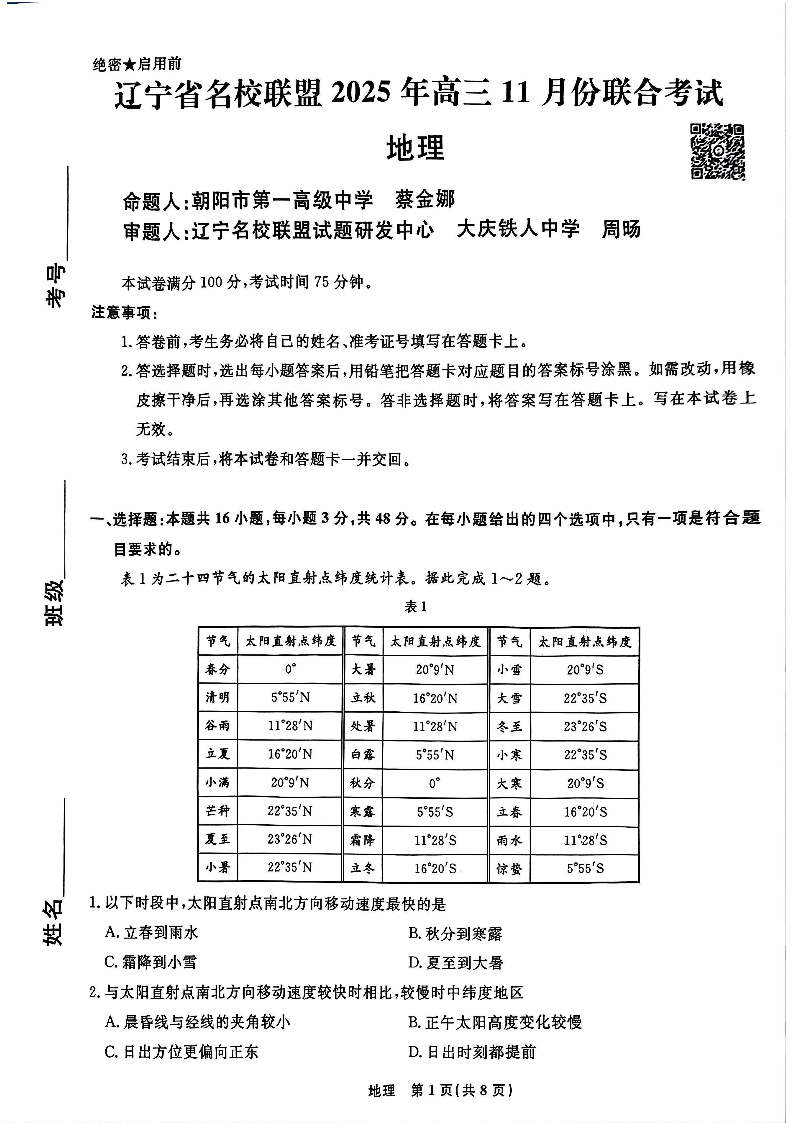 辽宁省名校联盟2025年高三11月份联合考试 地理.pdf