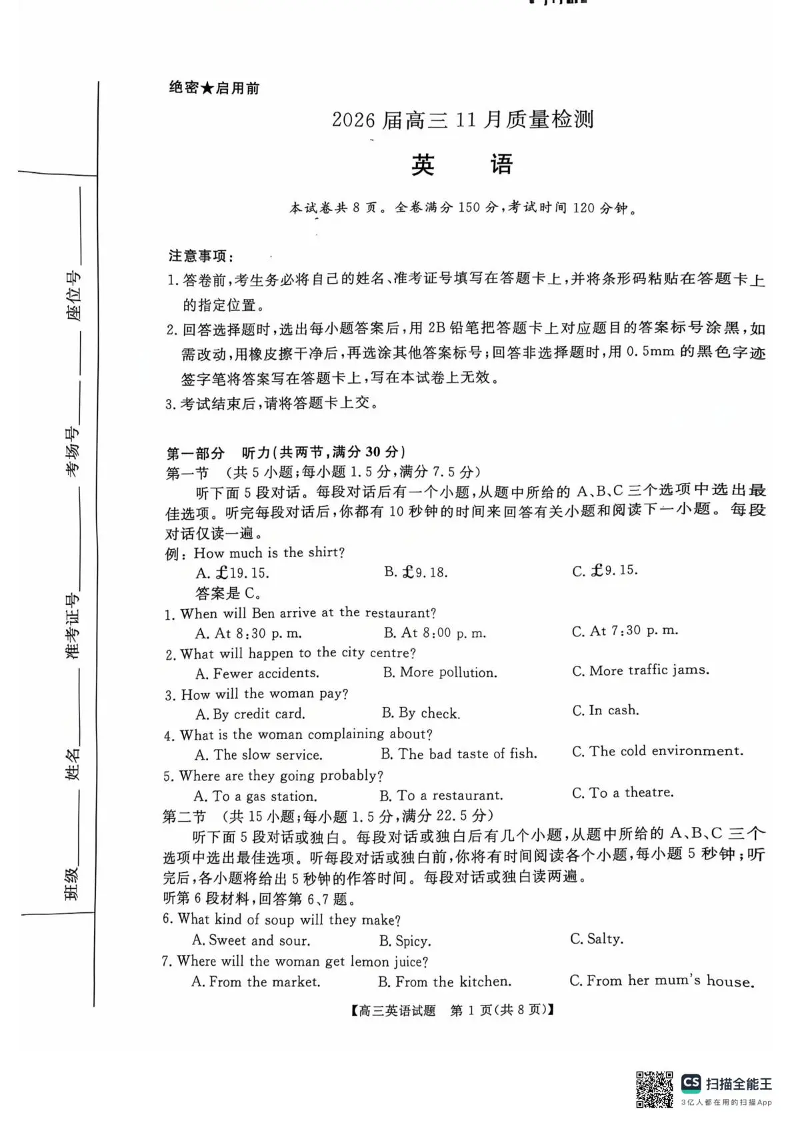 天壹名校联盟2026届高三11月质量检测 英语.pdf