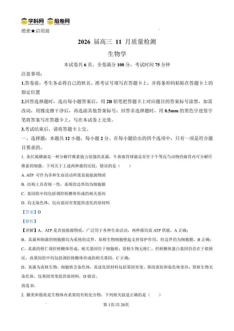 天壹名校联盟2026届高三11月质量检测 生物答案.pdf