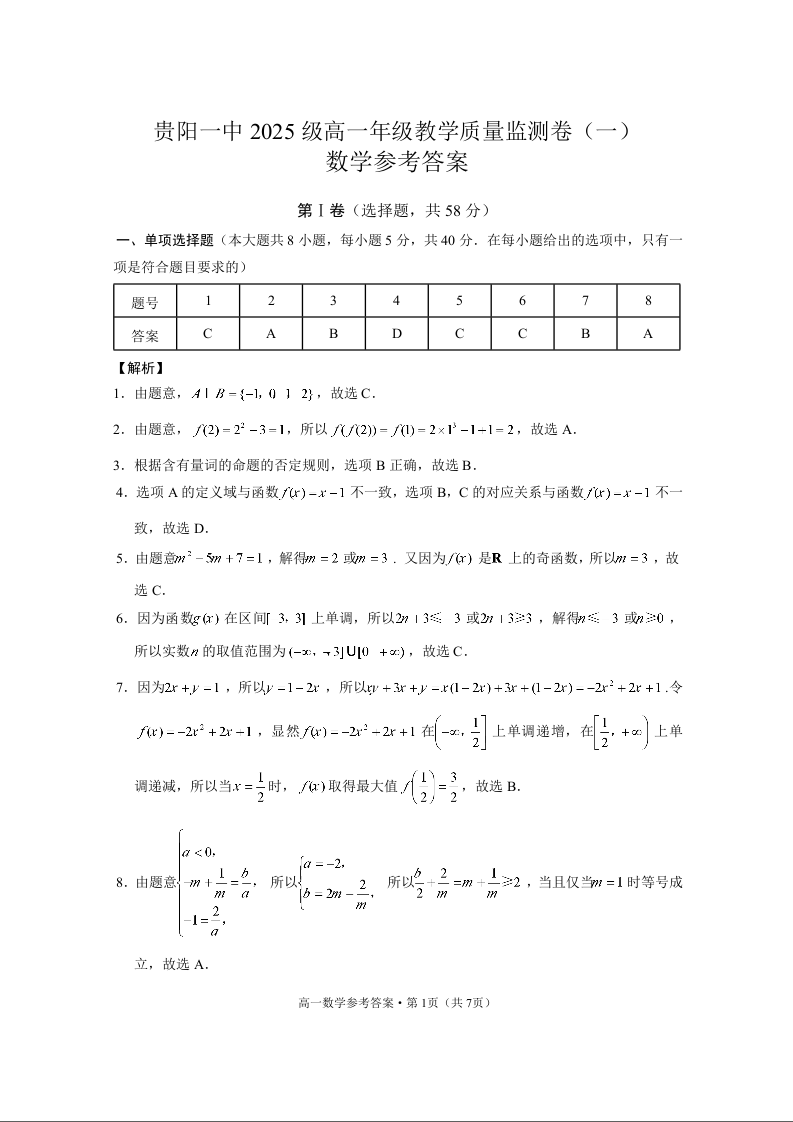 贵阳一中2025级高一年级教学质量监测卷(一)数学-答案.doc