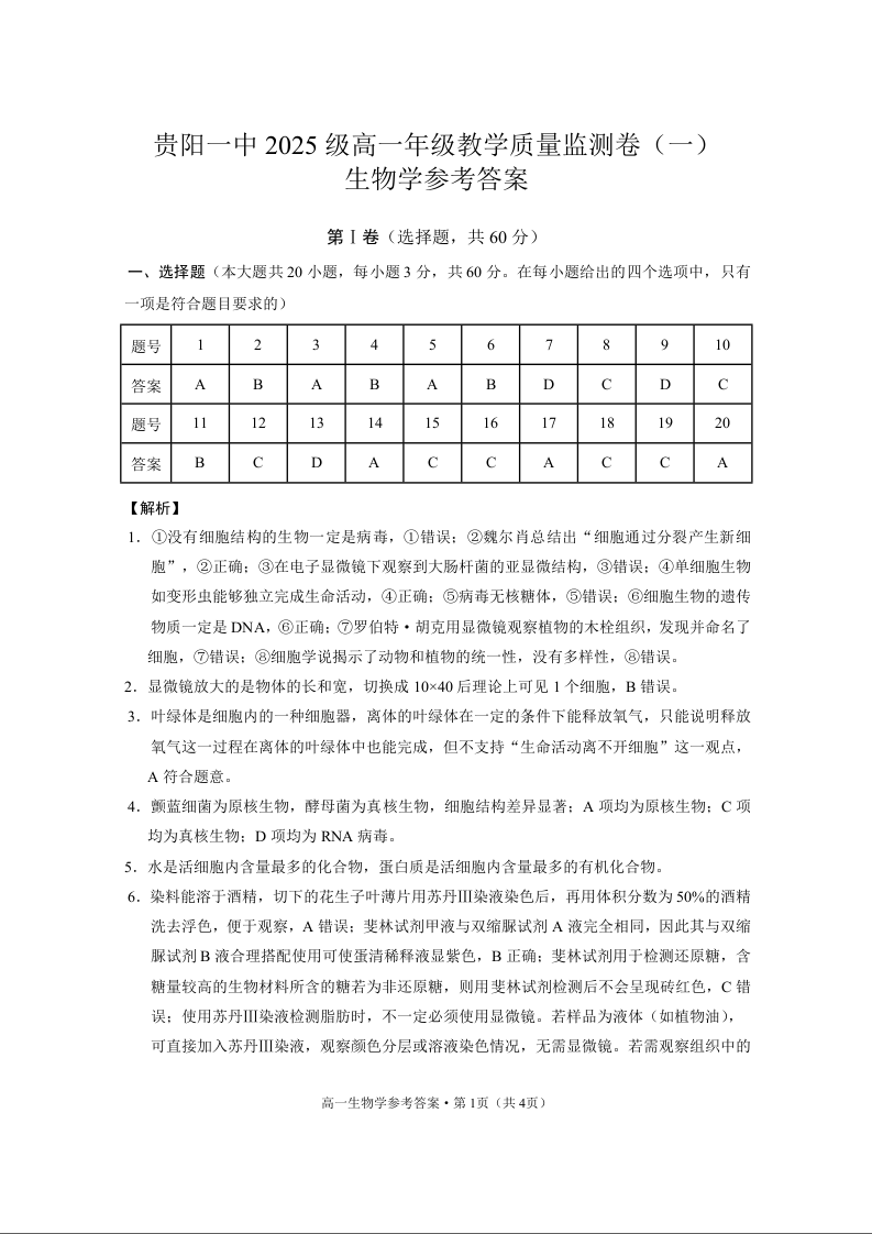 贵阳一中2025级高一年级教学质量监测卷(一)生物-答案.doc