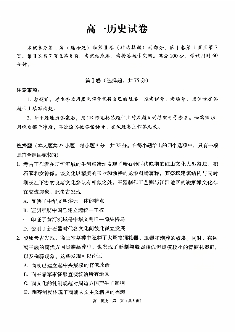 贵阳一中2025级高一年级教学质量监测卷(一)历史.pdf
