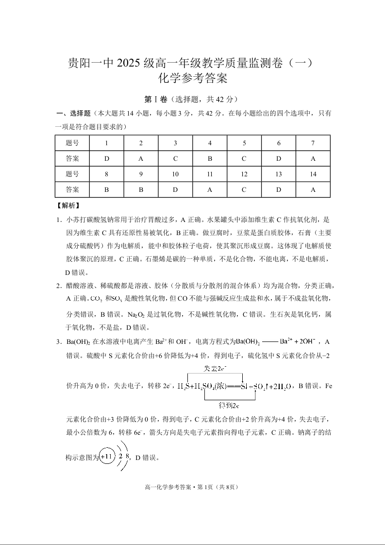 贵阳一中2025级高一年级教学质量监测卷(一)化学-答案.doc