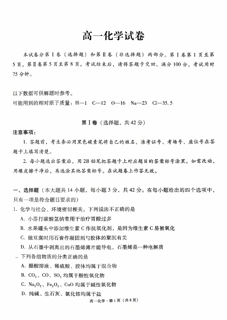 贵阳一中2025级高一年级教学质量监测卷(一)化学.pdf