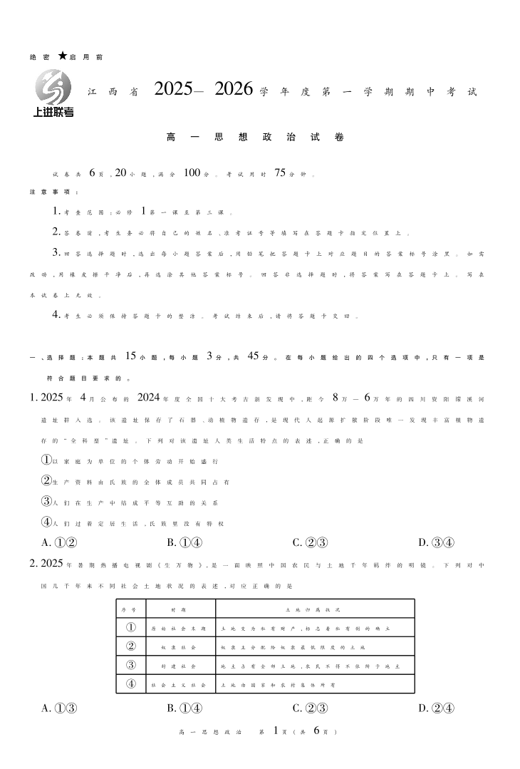 江西省上进联考2025-2026学年高一上学期11月期中考试·政治.pdf