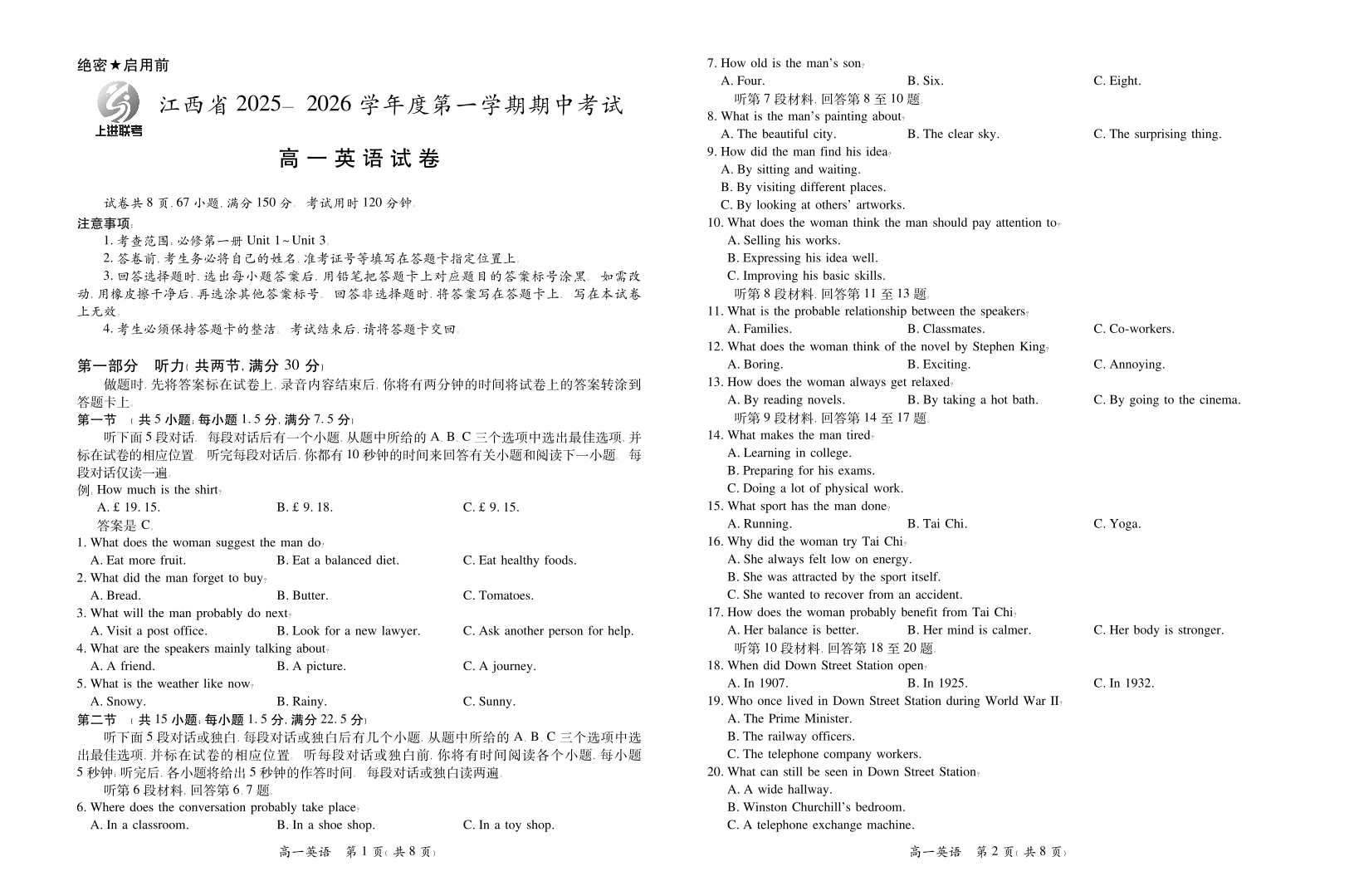 江西省上进联考2025-2026学年高一上学期11月期中考试·英语.pdf