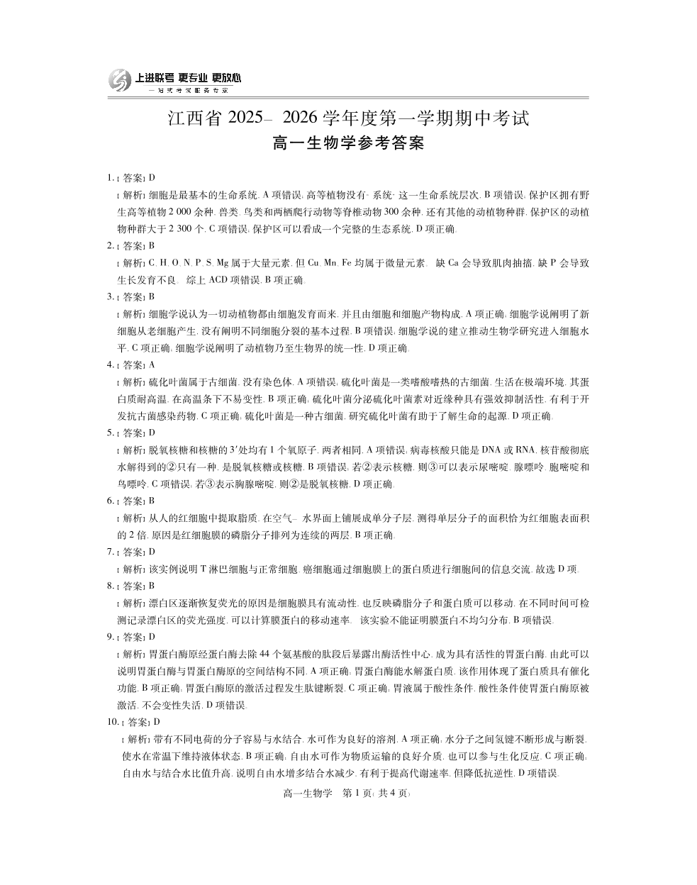 江西省上进联考2025-2026学年高一上学期11月期中考试·生物答案.pdf