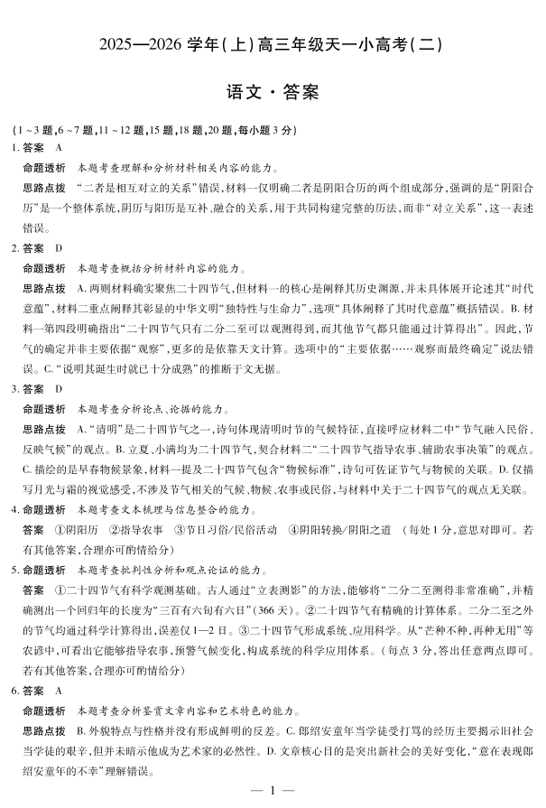 天一大联考·2025-2026学年(上)高三年级天一小高考(二)语文答案.pdf