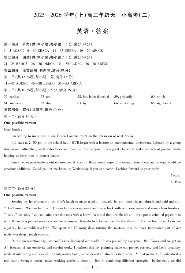 天一大联考·2025-2026学年(上)高三年级天一小高考(二)英语答案.pdf