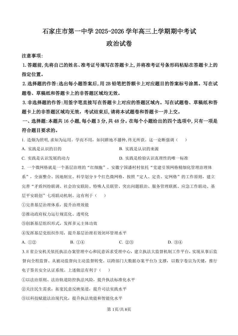 石家庄市第一中学2025-2026学年高三上学期期中考试 政治.docx