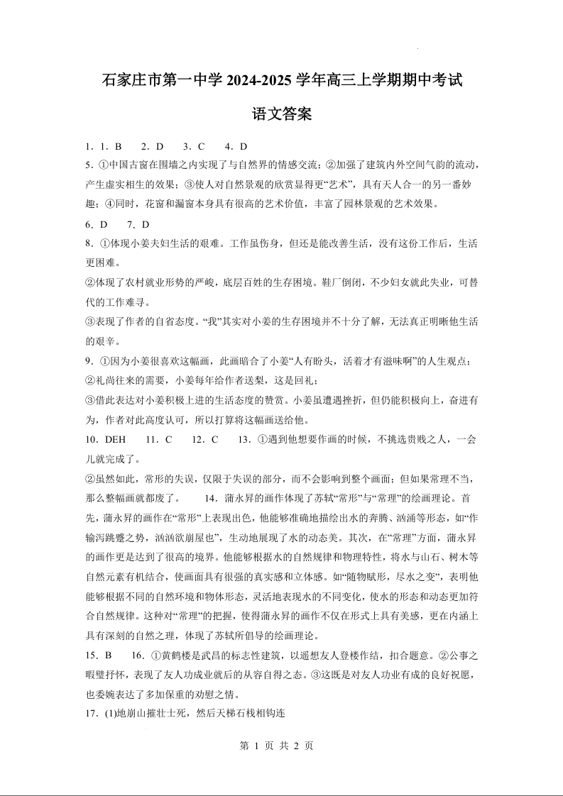 石家庄市第一中学2025-2026学年高三上学期期中考试 语文答案.docx