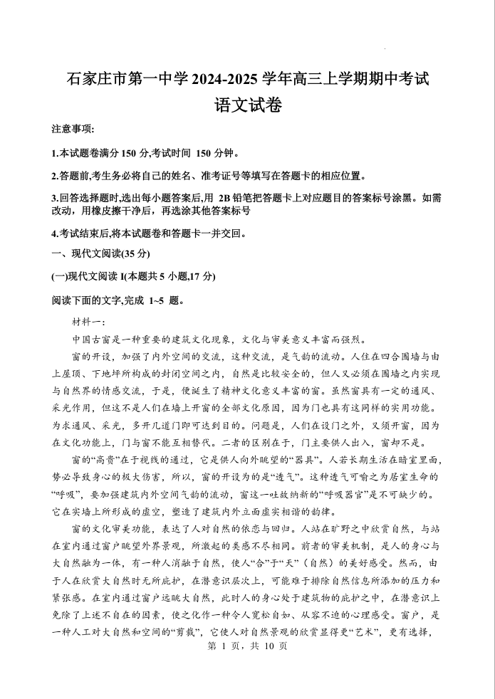 石家庄市第一中学2025-2026学年高三上学期期中考试 语文.docx