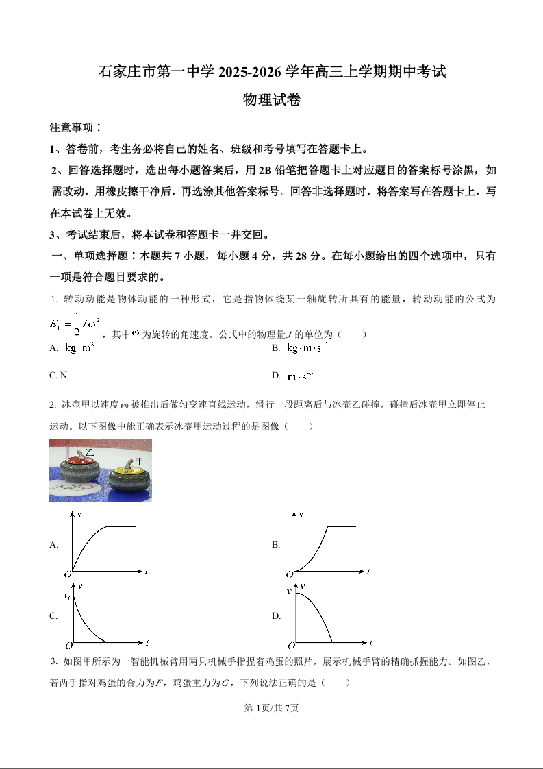 石家庄市第一中学2025-2026学年高三上学期期中考试 物理.docx