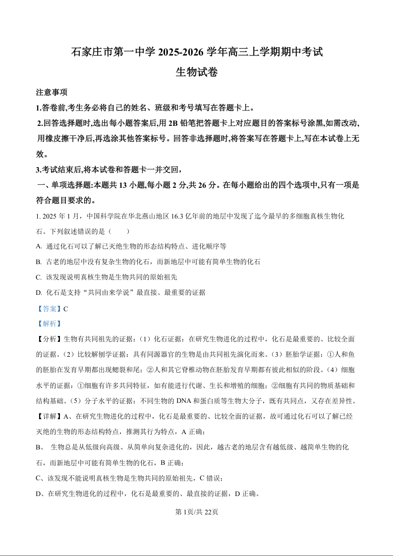 石家庄市第一中学2025-2026学年高三上学期期中考试 生物答案.docx