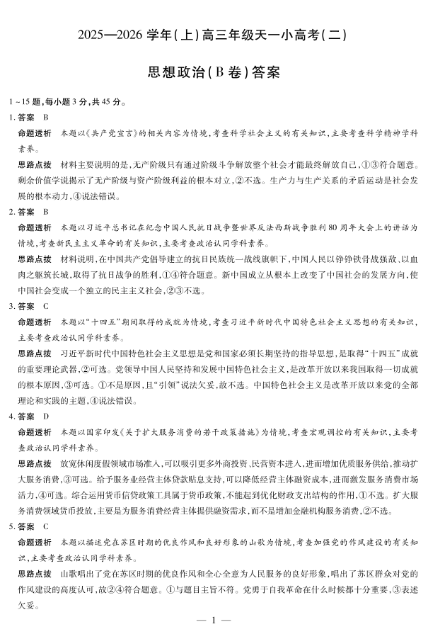 天一大联考·2025-2026学年(上)高三年级天一小高考(二)政治(B卷)答案.pdf