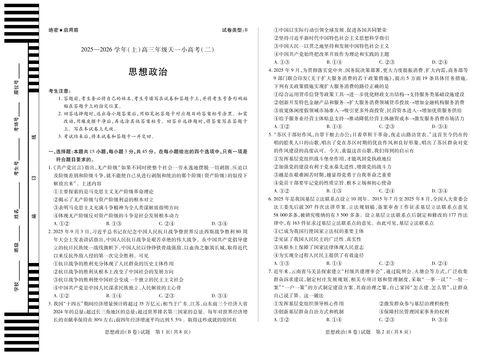 天一大联考·2025-2026学年(上)高三年级天一小高考(二)政治(B卷).pdf